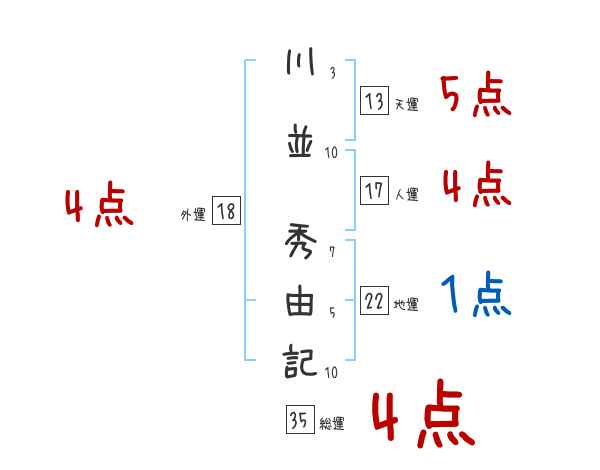 総運![]() | 川並秀由記さんの総運は35画の4つ星!温厚な性格で感受性が高い。穏和な性格で人望が厚い。 あなたの人生を表す1番重要な運勢です。生涯を通じて影響する総合運となり、主に50歳以降の晩年期に影響を及ぼします。 |