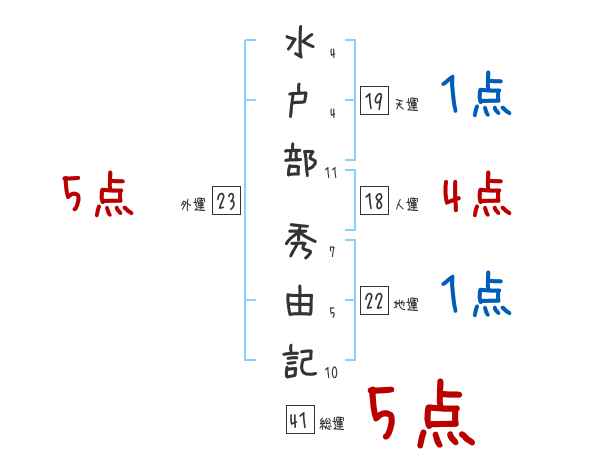 地運![]() | 水戸部秀由記さんの地運は22画の1つ星!努力することが苦手ないっぽう手先が器用。芸術性にも優れる。 個性を表す基礎的な運勢です。性格形成や対人関係、行動力など家庭環境に影響されます。主に誕生してから20歳くらいまでの若年期の運勢を表します。 |