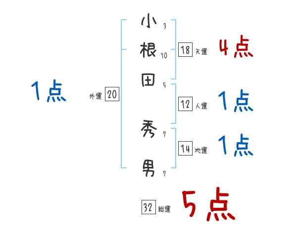 総運![]() | 小根田秀男さんの総運は32画の5つ星!柔軟性があり成功する。チャンスが多く金運が良い。 あなたの人生を表す1番重要な運勢です。生涯を通じて影響する総合運となり、主に50歳以降の晩年期に影響を及ぼします。 |