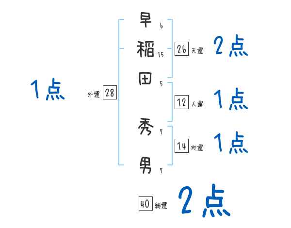 総運![]() | 早稲田秀男さんの総運は40画の2つ星!自信過剰で物事に固執するためトラブルに注意。 あなたの人生を表す1番重要な運勢です。生涯を通じて影響する総合運となり、主に50歳以降の晩年期に影響を及ぼします。 |