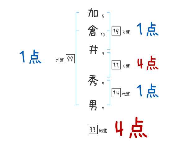 外運![]() | 加倉井秀男さんの外運は22画の1つ星!努力することが苦手ないっぽう手先が器用。芸術性にも優れる。 生活面を象徴する運勢です。外部から受ける影響力を表し、結婚運、家庭運や職場、環境への順応性を表します。 |