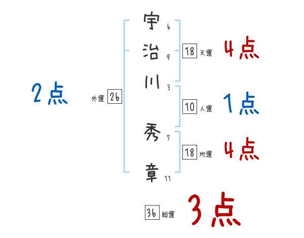 天運![]() | 宇治川秀章さんの天運は18画の4つ星!情熱的で剛気。忍耐力があり信頼される。 家系が持つ宿命的な運勢を表します。祖先から受け継いだ苗字ですので自分の力が及びません。家柄を象徴します。 |