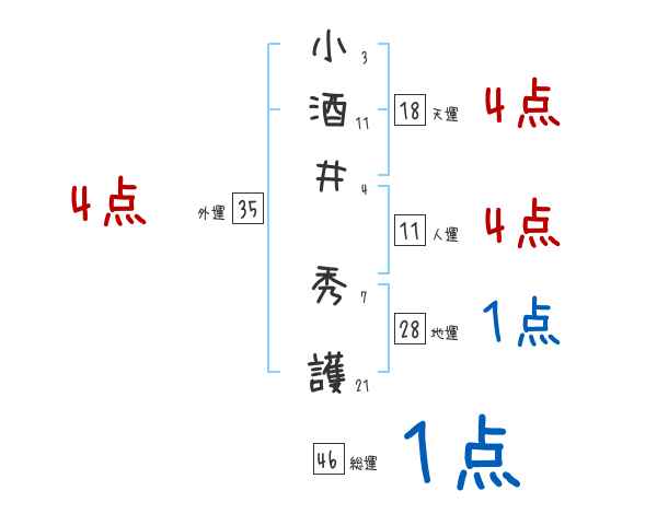 外運![]() | 小酒井秀護さんの外運は35画の4つ星!温厚な性格で感受性が高い。穏和な性格で人望が厚い。 生活面を象徴する運勢です。外部から受ける影響力を表し、結婚運、家庭運や職場、環境への順応性を表します。 |