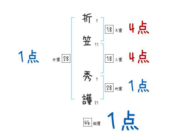 天運![]() | 折笠秀護さんの天運は18画の4つ星!情熱的で剛気。忍耐力があり信頼される。 家系が持つ宿命的な運勢を表します。祖先から受け継いだ苗字ですので自分の力が及びません。家柄を象徴します。 |