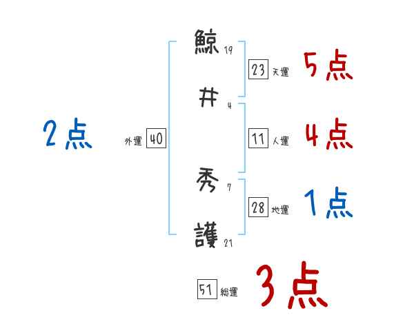 天運![]() | 鯨井秀護さんの天運は23画の5つ星!想像力に優れ活力がある。一代で成功し名誉を手に入れる。 家系が持つ宿命的な運勢を表します。祖先から受け継いだ苗字ですので自分の力が及びません。家柄を象徴します。 |