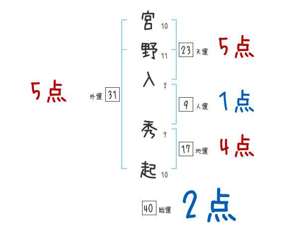 天運![]() | 宮野入秀起さんの天運は23画の5つ星!想像力に優れ活力がある。一代で成功し名誉を手に入れる。 家系が持つ宿命的な運勢を表します。祖先から受け継いだ苗字ですので自分の力が及びません。家柄を象徴します。 |