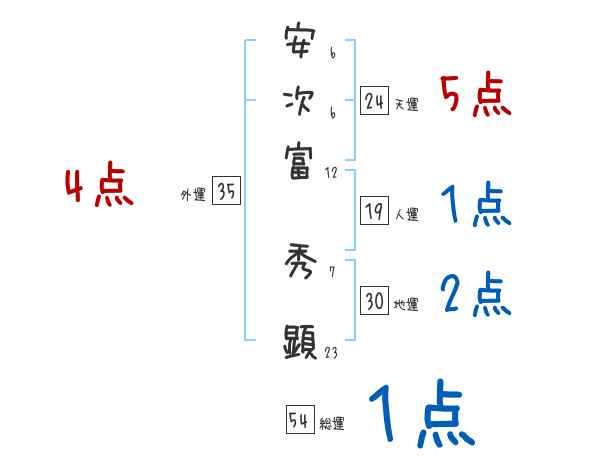 天運![]() | 安次富秀顕さんの天運は24画の5つ星!家庭運が良く順調な人生。金運にも恵まれる。 家系が持つ宿命的な運勢を表します。祖先から受け継いだ苗字ですので自分の力が及びません。家柄を象徴します。 |