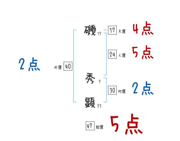 外運![]() | 磯秀顕さんの外運は40画の2つ星!自信過剰で物事に固執するためトラブルに注意。 生活面を象徴する運勢です。外部から受ける影響力を表し、結婚運、家庭運や職場、環境への順応性を表します。 |