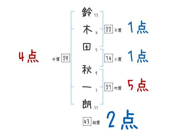 外運![]() | 鈴木田秋一朗さんの外運は29画の4つ星!完全主義で才能がある。厳格な心の持ち主。 生活面を象徴する運勢です。外部から受ける影響力を表し、結婚運、家庭運や職場、環境への順応性を表します。 |