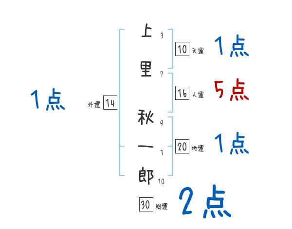 天運![]() | 上里秋一郎さんの天運は10画の1つ星!不安を感じやすい傾向。ストレスを抱えないように注意しましょう。 家系が持つ宿命的な運勢を表します。祖先から受け継いだ苗字ですので自分の力が及びません。家柄を象徴します。 |