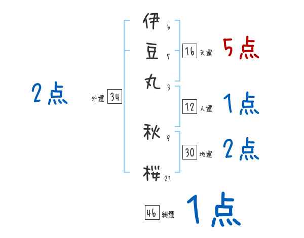 天運![]() | 伊豆丸秋桜さんの天運は16画の5つ星!人望が厚く大きく発展する。逆転成功が見える。 家系が持つ宿命的な運勢を表します。祖先から受け継いだ苗字ですので自分の力が及びません。家柄を象徴します。 |
