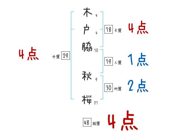 天運![]() | 木戸脇秋桜さんの天運は18画の4つ星!情熱的で剛気。忍耐力があり信頼される。 家系が持つ宿命的な運勢を表します。祖先から受け継いだ苗字ですので自分の力が及びません。家柄を象徴します。 |