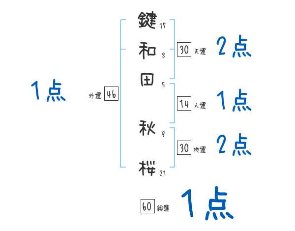 天運![]() | 鍵和田秋桜さんの天運は30画の2つ星!浮き沈みの激しさに注意しましょう。 家系が持つ宿命的な運勢を表します。祖先から受け継いだ苗字ですので自分の力が及びません。家柄を象徴します。 |