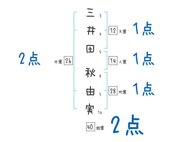 外運![]() | 三井田秋由実さんの外運は26画の2つ星!波瀾万丈かも。信頼できる人を大事にしましょう。 生活面を象徴する運勢です。外部から受ける影響力を表し、結婚運、家庭運や職場、環境への順応性を表します。 |