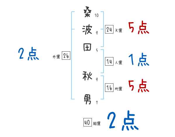 天運![]() | 桑波田秋男さんの天運は24画の5つ星!家庭運が良く順調な人生。金運にも恵まれる。 家系が持つ宿命的な運勢を表します。祖先から受け継いだ苗字ですので自分の力が及びません。家柄を象徴します。 |