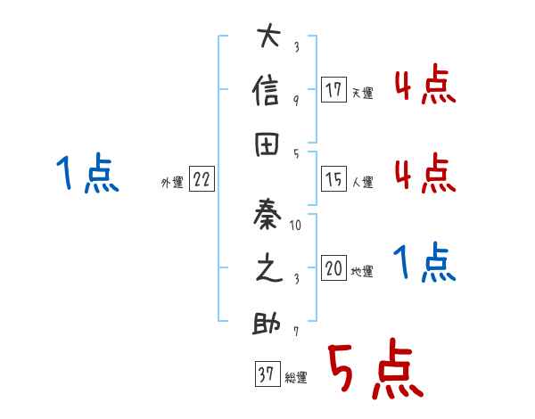 総運![]() | 大信田秦之助さんの総運は37画の5つ星!努力家で順応性に優れる。現実的な考え方ができ忠実に物事をこなす。 あなたの人生を表す1番重要な運勢です。生涯を通じて影響する総合運となり、主に50歳以降の晩年期に影響を及ぼします。 |