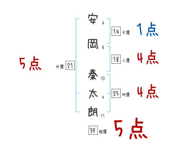 | 外運  | 安岡秦太朗さんの外運は21画の5つ星!統率力がある。独立し成功する。名誉を手に入れる。生活面を象徴する運勢です。外部から受ける影響力を表し、結婚運、家庭運や職場、環境への順応性を表します。 |
