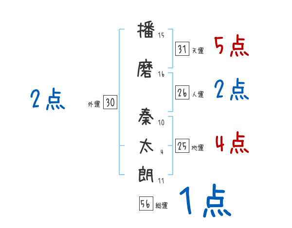 天運![]() | 播磨秦太朗さんの天運は31画の5つ星!社交性があり判断力に優れる。順風満帆な人生で円満な生活。 家系が持つ宿命的な運勢を表します。祖先から受け継いだ苗字ですので自分の力が及びません。家柄を象徴します。 |