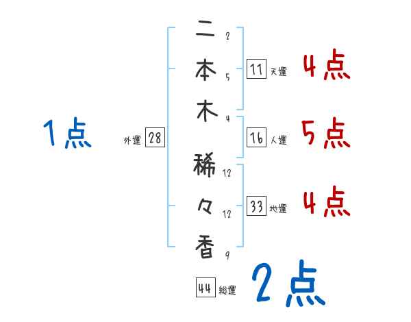 総運![]() | 二本木稀々香さんの総運は44画の2つ星!誠実で慎重な性格。物事を考えすぎないように注意しましょう。 あなたの人生を表す1番重要な運勢です。生涯を通じて影響する総合運となり、主に50歳以降の晩年期に影響を及ぼします。 |