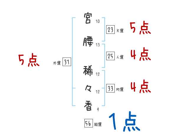 天運![]() | 宮腰稀々香さんの天運は23画の5つ星!想像力に優れ活力がある。一代で成功し名誉を手に入れる。 家系が持つ宿命的な運勢を表します。祖先から受け継いだ苗字ですので自分の力が及びません。家柄を象徴します。 |
