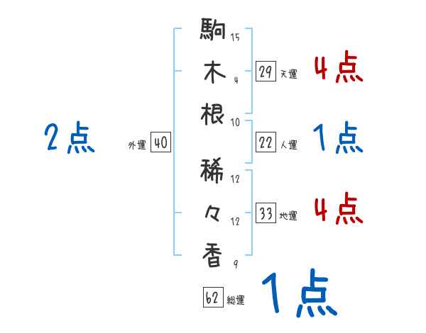 地運![]() | 駒木根稀々香さんの地運は33画の4つ星!権力志向でプライドが高い。勇気があり運を切り開き成功する。 個性を表す基礎的な運勢です。性格形成や対人関係、行動力など家庭環境に影響されます。主に誕生してから20歳くらいまでの若年期の運勢を表します。 |