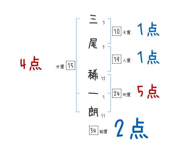 総運![]() | 三尾稀一朗さんの総運は34画の2つ星!独創性に優れるが、自尊心が強く災難に注意しましょう。 あなたの人生を表す1番重要な運勢です。生涯を通じて影響する総合運となり、主に50歳以降の晩年期に影響を及ぼします。 |