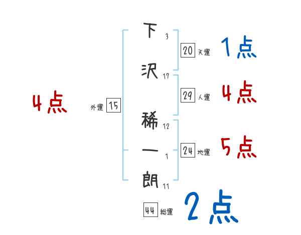 総運![]() | 下沢稀一朗さんの総運は44画の2つ星!誠実で慎重な性格。物事を考えすぎないように注意しましょう。 あなたの人生を表す1番重要な運勢です。生涯を通じて影響する総合運となり、主に50歳以降の晩年期に影響を及ぼします。 |