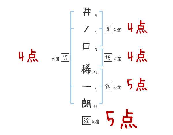外運![]() | 井ノ口稀一朗さんの外運は17画の4つ星!積極的な行動力。地位を気づき財産を手に入れる。純粋な心と直感力。 生活面を象徴する運勢です。外部から受ける影響力を表し、結婚運、家庭運や職場、環境への順応性を表します。 |