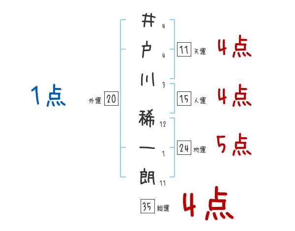 天運![]() | 井戸川稀一朗さんの天運は11画の4つ星!着実に富や地位を得る幸運な人生。 家系が持つ宿命的な運勢を表します。祖先から受け継いだ苗字ですので自分の力が及びません。家柄を象徴します。 |