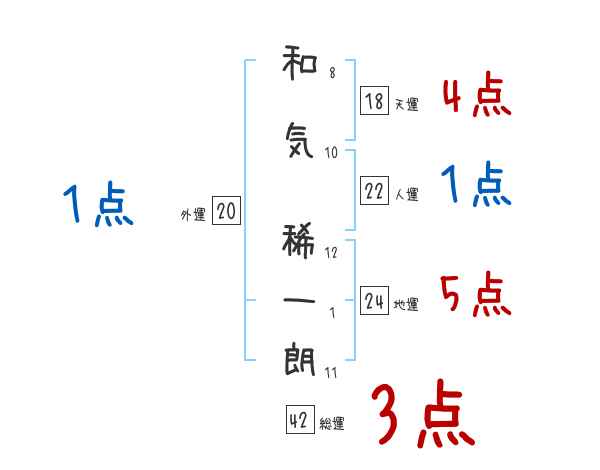 総運![]() | 和気稀一朗さんの総運は42画の3つ星!病気に注意。多芸であるが消極的でおとなしい。 あなたの人生を表す1番重要な運勢です。生涯を通じて影響する総合運となり、主に50歳以降の晩年期に影響を及ぼします。 |