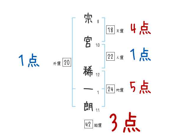 天運![]() | 宗宮稀一朗さんの天運は18画の4つ星!情熱的で剛気。忍耐力があり信頼される。 家系が持つ宿命的な運勢を表します。祖先から受け継いだ苗字ですので自分の力が及びません。家柄を象徴します。 |