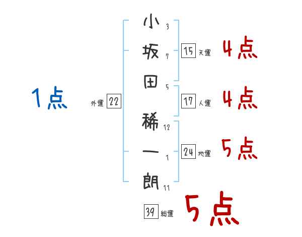 外運![]() | 小坂田稀一朗さんの外運は22画の1つ星!努力することが苦手ないっぽう手先が器用。芸術性にも優れる。 生活面を象徴する運勢です。外部から受ける影響力を表し、結婚運、家庭運や職場、環境への順応性を表します。 |