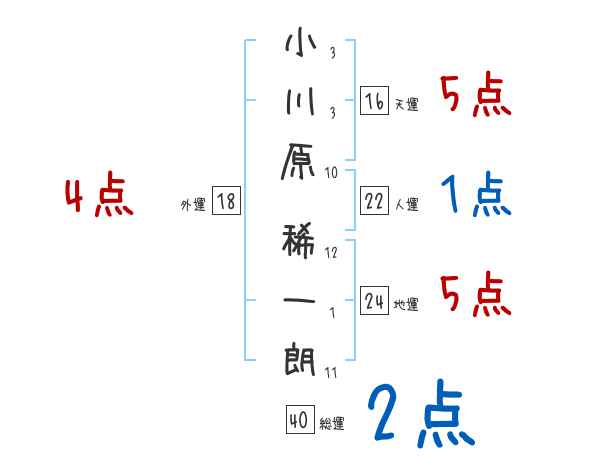 天運![]() | 小川原稀一朗さんの天運は16画の5つ星!人望が厚く大きく発展する。逆転成功が見える。 家系が持つ宿命的な運勢を表します。祖先から受け継いだ苗字ですので自分の力が及びません。家柄を象徴します。 |