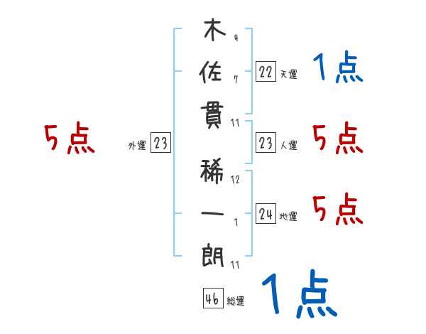 外運![]() | 木佐貫稀一朗さんの外運は23画の5つ星!想像力に優れ活力がある。一代で成功し名誉を手に入れる。 生活面を象徴する運勢です。外部から受ける影響力を表し、結婚運、家庭運や職場、環境への順応性を表します。 |