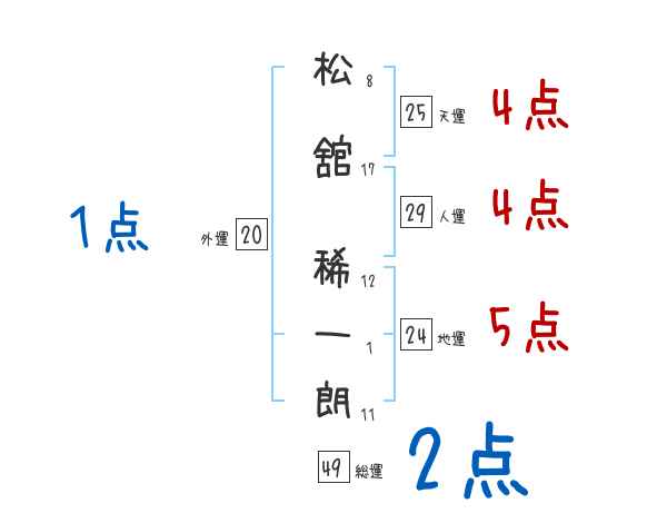 人運![]() | 松舘稀一朗さんの人運は29画の4つ星!完全主義で才能がある。厳格な心の持ち主。 性格や才能などを表す2番目に重要な運勢です。人間関係や協調性、社会的な成功に影響します。主に20歳から50歳ぐらいまでの中年期の運勢を表します。 |