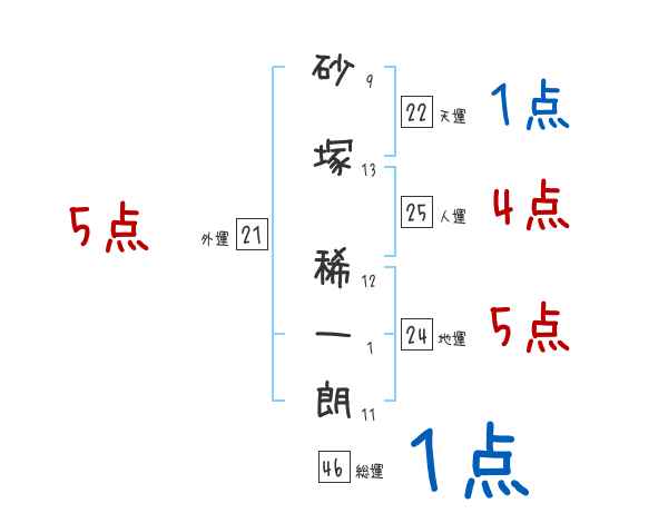天運![]() | 砂塚稀一朗さんの天運は22画の1つ星!努力することが苦手ないっぽう手先が器用。芸術性にも優れる。 家系が持つ宿命的な運勢を表します。祖先から受け継いだ苗字ですので自分の力が及びません。家柄を象徴します。 |