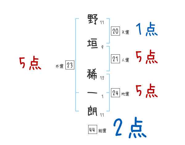 総運![]() | 野垣稀一朗さんの総運は44画の2つ星!誠実で慎重な性格。物事を考えすぎないように注意しましょう。 あなたの人生を表す1番重要な運勢です。生涯を通じて影響する総合運となり、主に50歳以降の晩年期に影響を及ぼします。 |