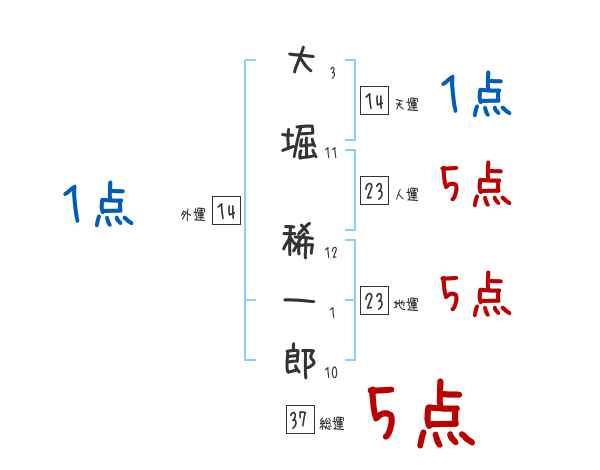 人運![]() | 大堀稀一郎さんの人運は23画の5つ星!想像力に優れ活力がある。一代で成功し名誉を手に入れる。 性格や才能などを表す2番目に重要な運勢です。人間関係や協調性、社会的な成功に影響します。主に20歳から50歳ぐらいまでの中年期の運勢を表します。 |