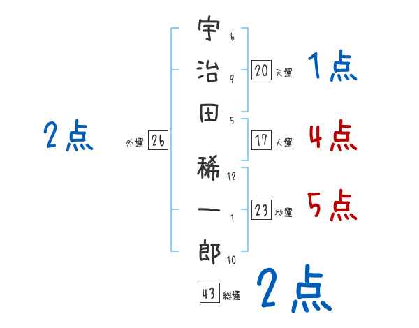 外運![]() | 宇治田稀一郎さんの外運は26画の2つ星!波瀾万丈かも。信頼できる人を大事にしましょう。 生活面を象徴する運勢です。外部から受ける影響力を表し、結婚運、家庭運や職場、環境への順応性を表します。 |