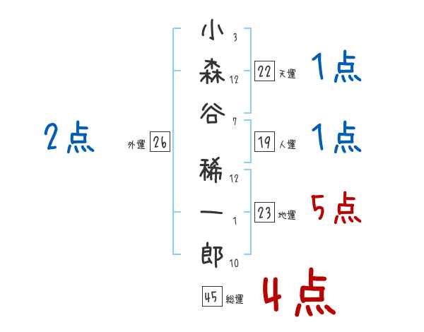 天運![]() | 小森谷稀一郎さんの天運は22画の1つ星!努力することが苦手ないっぽう手先が器用。芸術性にも優れる。 家系が持つ宿命的な運勢を表します。祖先から受け継いだ苗字ですので自分の力が及びません。家柄を象徴します。 |