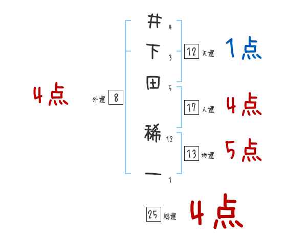 天運![]() | 井下田稀一さんの天運は12画の1つ星!簡単な失敗で諦めてしまいやすいかも。着実に行動すると良いでしょう。 家系が持つ宿命的な運勢を表します。祖先から受け継いだ苗字ですので自分の力が及びません。家柄を象徴します。 |