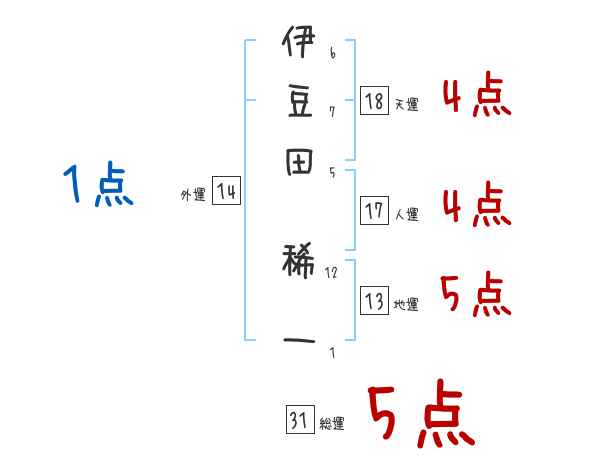 天運![]() | 伊豆田稀一さんの天運は18画の4つ星!情熱的で剛気。忍耐力があり信頼される。 家系が持つ宿命的な運勢を表します。祖先から受け継いだ苗字ですので自分の力が及びません。家柄を象徴します。 |