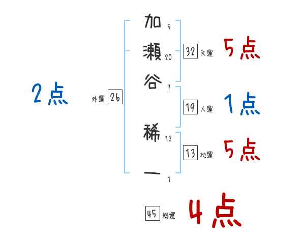 総運![]() | 加瀬谷稀一さんの総運は45画の4つ星!もくもくと物事を進め達成する。地味な努力家。 あなたの人生を表す1番重要な運勢です。生涯を通じて影響する総合運となり、主に50歳以降の晩年期に影響を及ぼします。 |