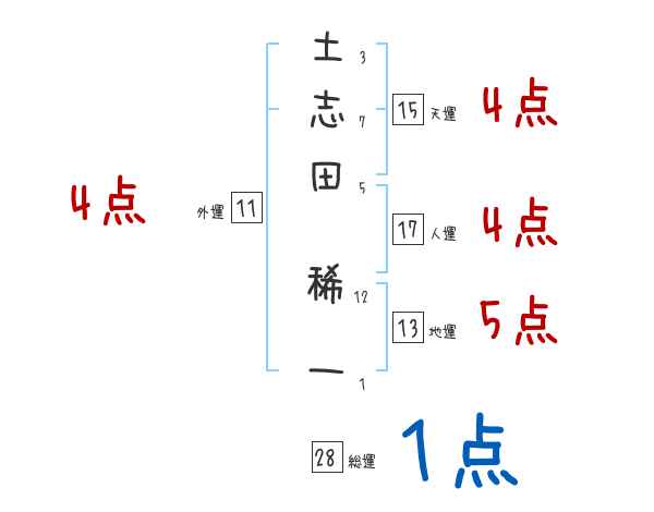 総運![]() | 土志田稀一さんの総運は28画の1つ星!家庭環境に注意。スポーツで活躍できる能力があるかも。 あなたの人生を表す1番重要な運勢です。生涯を通じて影響する総合運となり、主に50歳以降の晩年期に影響を及ぼします。 |