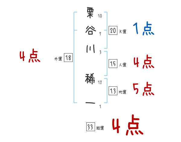総運![]() | 栗谷川稀一さんの総運は33画の4つ星!権力志向でプライドが高い。勇気があり運を切り開き成功する。 あなたの人生を表す1番重要な運勢です。生涯を通じて影響する総合運となり、主に50歳以降の晩年期に影響を及ぼします。 |