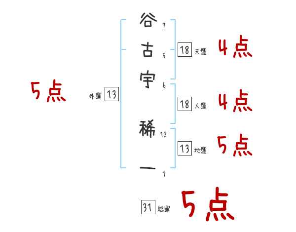 総運![]() | 谷古宇稀一さんの総運は31画の5つ星!社交性があり判断力に優れる。順風満帆な人生で円満な生活。 あなたの人生を表す1番重要な運勢です。生涯を通じて影響する総合運となり、主に50歳以降の晩年期に影響を及ぼします。 |