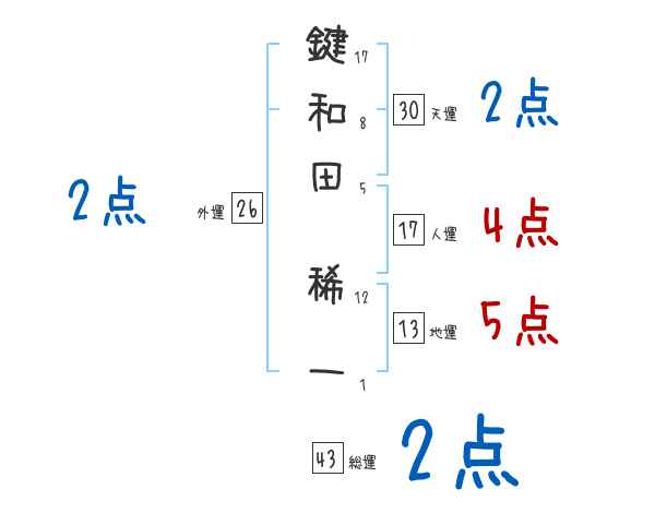 鍵和田稀一さんの画数の鑑定結果