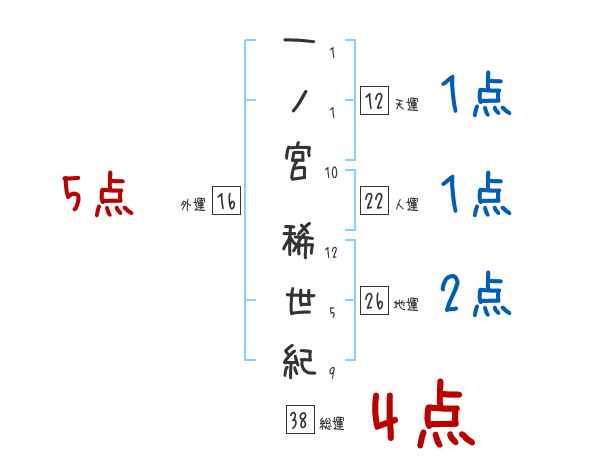 人運![]() | 一ノ宮稀世紀さんの人運は22画の1つ星!努力することが苦手ないっぽう手先が器用。芸術性にも優れる。 性格や才能などを表す2番目に重要な運勢です。人間関係や協調性、社会的な成功に影響します。主に20歳から50歳ぐらいまでの中年期の運勢を表します。 |