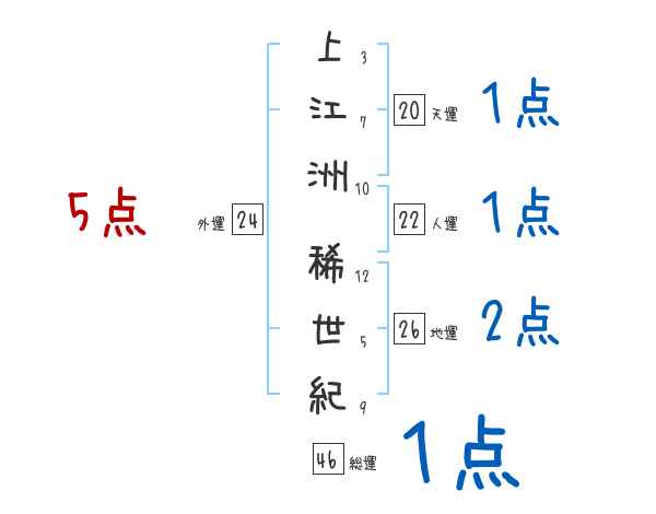 外運![]() | 上江洲稀世紀さんの外運は24画の5つ星!家庭運が良く順調な人生。金運にも恵まれる。 生活面を象徴する運勢です。外部から受ける影響力を表し、結婚運、家庭運や職場、環境への順応性を表します。 |