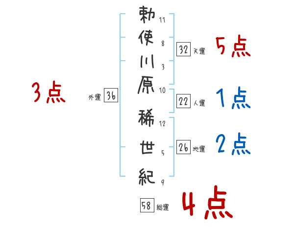 天運![]() | 勅使川原稀世紀さんの天運は32画の5つ星!柔軟性があり成功する。チャンスが多く金運が良い。 家系が持つ宿命的な運勢を表します。祖先から受け継いだ苗字ですので自分の力が及びません。家柄を象徴します。 |